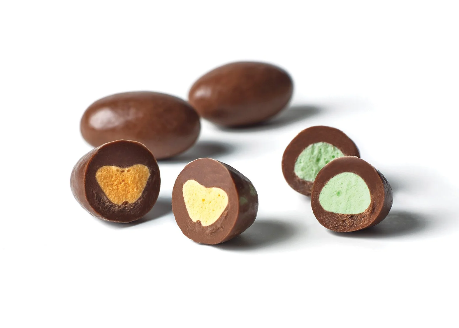 A crisp, starch moulded centre in four different flavours - Orange, Strawberry, Lime and Banana - encased in rich creamy milk compound chocolate, then highly polished for a shiny finish.
